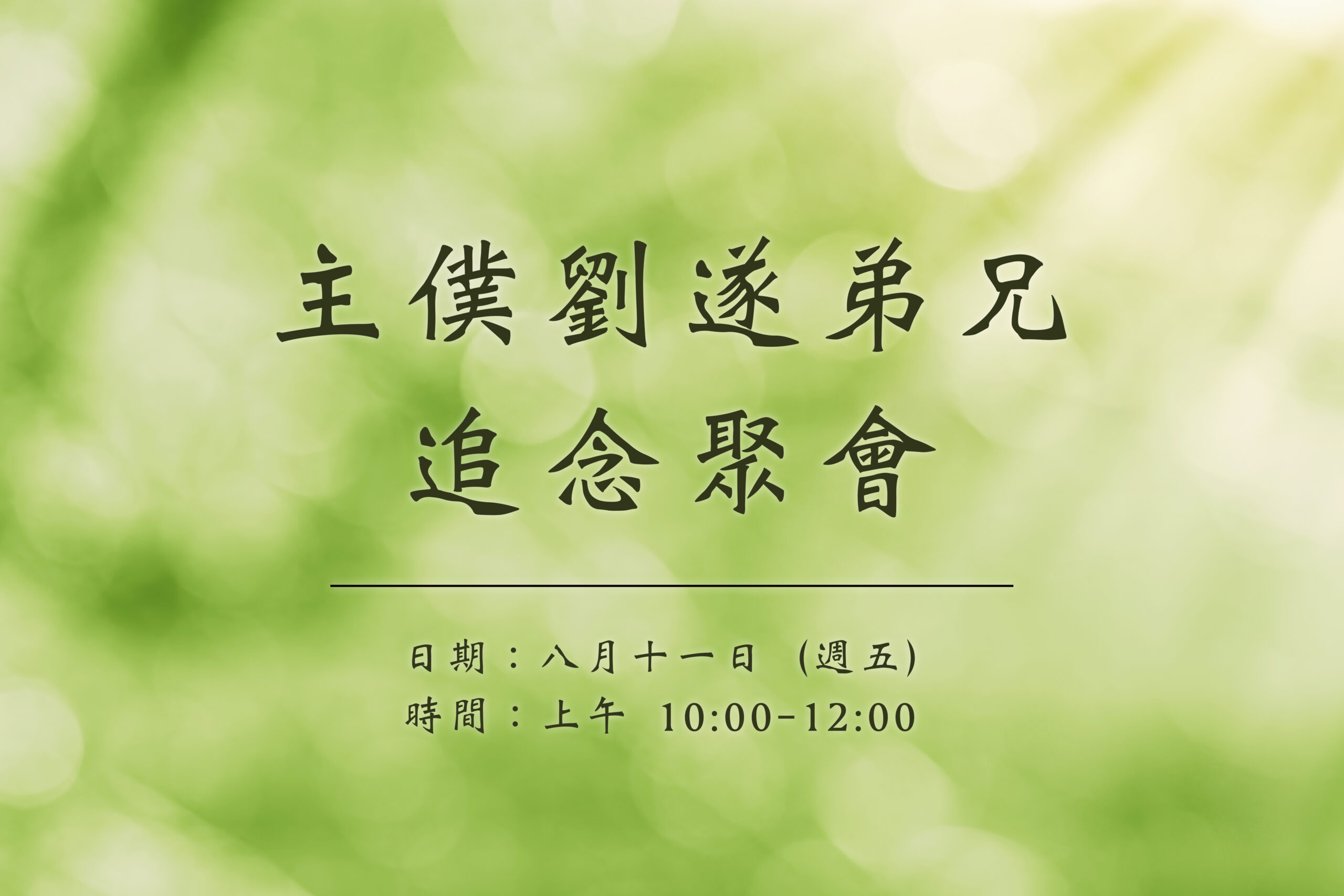 追念劉遂弟兄的聚會,將於八月十一日(週五)上午十時至十二時,在臺北巿召會信基大樓大會場舉行(臺北巿信義路四段 460 號 B2)。鑒於會場容量有限,僅限受邀之臺灣及海外眾召會代表,憑邀請卡赴會。凡無邀請卡者一概不得入場,敬祈見諒。聚會全程將採網路直播,以慰各地聖徒關切之情。