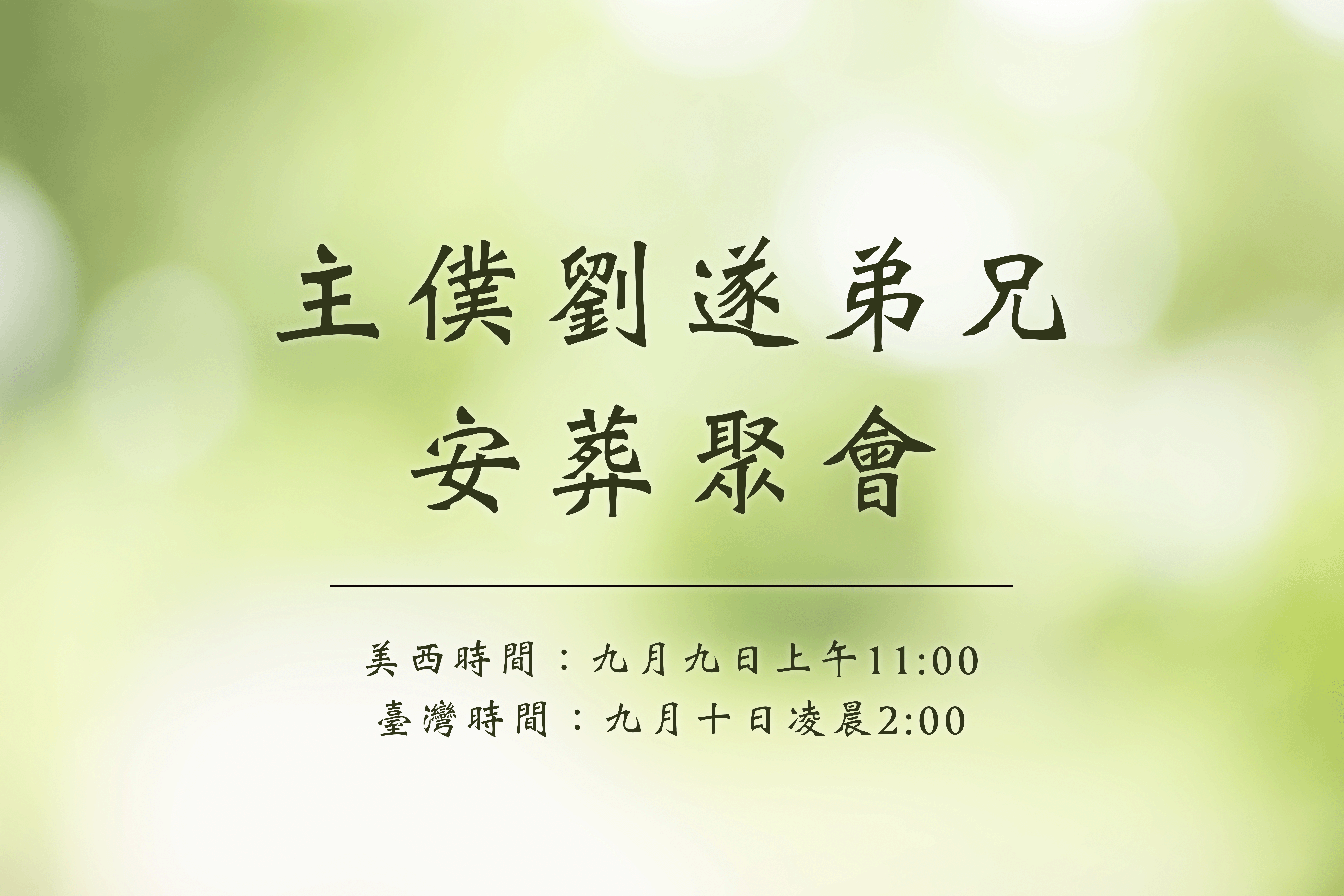 主僕劉遂弟兄將與愛妻劉陳路得姊妹合葬於美國加州玫瑰崗恩典陵園,安葬聚會訂於九月九日(週六)上午十一時(當地時間)在恩典陵園舉行。